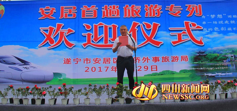 四川新闻网遂宁9月30日讯(袁方绪 朱娟图\文)9月29日上午10:30,“贵州”旅游专列800多名游客,承载着贵州人民的友好情谊,来到美丽祥和的国家级4A级旅游景区“七彩明珠景区”,参加遂宁市安居区政府、区旅游局、七彩明珠景区共同主办的“安居首趟旅游专列”欢迎活动。安居区副区长曾勇、旅游局局长李涛、旅游局郑友均副局长、祥瑞公司总经理唐明珍、巴岳娱乐有限公司总经理彭林等出席活动。  | | 安居区副区长曾勇致辞 |