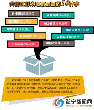 | 异地搬迁新面貌 “为政之道,以顺民心为本,以厚民生为本,以安而不扰民为本。”党的十九大强调,坚持以人民为中心,立党为公、执政为民,抓住群众最关心最直接最现实的问题,努力清除影响人的全面发展的体制机制障碍,加快实现基本公共服务均等化。今年4月,安居区通过大梳理、大走访、大收集、大调查,启动整治“群众最不满意的10件事”。 调查了解 找出群众最不满意的事 整治群众最不满意的事,首先要了解哪些是“群众最不满意的事情”。通过汇总,梳理出“群众最不满意的10件事”,涉及农村基础设施建设、城乡环境提升等10大类48个小项,安居区委及时组织和召开公众评议反馈问题整改工作专题部署会议,深入调查问题根源,组织各责任单位研究制定具体整治实施方案,明确责任领导和具体责任人,及时制定“时间表”“路线图”,按照“立即解决、限期解决、分期解决、政策限制”四个要求,落实整改任务。 7月,安居区交运局、卫计局、食药监局、城管分局、环保局等14个单位为实施责任单位,正式启动整治“群众最不满意的10件事”。 积极改进 让群众成为最大受益者 如果说,“取得实效”体现的实践标准,那么,“群众满意”体现的就是群众标准。近年来,随着安居区人口逐步增长,公共交通也步入了发展“快车道”,城区无公交站台被列入“群众最不满意的10件事”。安居区交运局运管所所长罗焕宾介绍,“一接到‘群众最不满意的10件事’相关文件,区交运局马上联合城管、规划、交警等相关部门展开讨论。”据介绍,结合创建全国文明城市,改善城区公交站台系统。8月底,30座公交站台投入使用,总投资约400万元。 11月17日,记者在安居区信访局公交站台看到,一座造型现代,大气美观的新式公交站台前,不少市民正在等车。新站台不仅外形美观,更增添了实用功能,设置了座位,在方便市民出行的同时,也进一步提升了安居区的城市形象。“现在的公交站台为我们的出行带来很大便利,即使不坐公交车,也可以坐着歇歇脚。”年近50的张女士对记者说。 新型公交站台的出现还改变了部分路段拥堵情况。港湾式站台向内凹,公交车进站不会影响原路其他直行车辆,从而减少公交车进出站对道路交通的影响。 不仅是区交运局,各牵头单位在接到“群众最不满意的10件事”,都在第一时间明确工作任务,细化工作责任,制定工作机制,积极推动整治任务落地落实。 “群众有需要,我们就要办好。”安居区交运局工程股股长何晓明表示,结合脱贫攻坚工作,今年安居区完成农村村组道路建设100余公里。 “农田水利影响群众生产生活”在安居区水务局的整治下,截至目前,维护水池水窖130处,维护堰塘堰闸167处,修护水冲毁工程342处。 “农村医疗水平低”在安居区卫计局的整治下,今年共修建完成25个标准村卫生室,同时开展定期培训,提高基础医务人员业务水平。 …… 深入督查 不断满足百姓所需 今年9月,安居区委督查室深入“群众最不满意的10件事”专项整治各牵头单位,对相关工作推进情况进行了督查,通过查阅资料、查看现场、座谈交流等方式展开督查。据了解,“群众最不满意的10件事”涉及的48个小项中,20余项限期解决的事项取得阶段性成效,完成油烟净化设施安装21家,拆除破旧广告1800余起,新建城区公交站台15处30座,建成留守儿童寄宿托管学校5所等,其余28项长远性、基础性问题整改正在有序推进。 问题得到解决,群众看到希望,才会感到满意。安居区还将坚持“以百姓心为心”,以求真务实的作风、认真负责的态度,听百姓之言,察百姓之难,解百姓之苦,全面落实整治工作,认真解决突出问题,全心全意为人民服务,以风清气正的良好环境和实际成效取信于民。 典型案例 电动三轮车 非法载客行为明显减少 近年来,安居城区出现大量从事非法运营的电动三轮车,严重扰乱了安居区交通秩序和社会环境,威胁和损害人民群众生命财产安全,电动三轮车非法载客存在安全隐患被列入“群众最不满意的10件事”。 今年以来,安居区交警大队加派人手,将电动三轮车专项整治行动常态化,尤其针对人流、车流量大的兴贸路、兴业路及琼江路一带,做到时时监管。通过整改,区交警大队一中队队长向文辉告诉记者,今年接到的电动三轮车有关投诉相较去年同期下降了50%以上。而最让他感到高兴的是,通过区交警大队不断的教育宣传,有不少做电动三轮车生意的居民自愿放弃这门行当。 建标准村卫生室 改善群众就医环境 随着群众对医疗卫生需求的日益增加,村卫生室设施设备缺乏、医疗水平低被列入“群众最不满意10件事之一”。为积极满足群众需求,更好地为群众服务。记者从区卫计局了解到,安居区高度重视基层公共卫生体系建设。截至目前,安居区共建有农村标准村卫生室230个,下一步,还将继续为各行政村建设标准村卫生室,打牢农村医疗预防保健网的基础,保障村民身体健康。而随着基础设施建设、村医生配备和业务培训加强,全区基层医疗卫生服务条件得到明显改善,极大方便了群众就近就医,节约了医疗支出成本,实现了小病不出村的目标,群众就医环境及就医条件明显改善。 为留守儿童 营造良好成长空间 近年来,随着劳务经济的迅速发展,大量劳动力外出增收,由此产生的留守儿童问题已成为当前严重的社会问题之一。据不完全统计,安居区现有留守儿