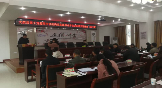 2017年12月22日,召开2017年度内设机构及直属事业单位负责人述责述廉工作会(第二期),分管领导对述责人员进行了点评。 1月12日,大英县国土资源局举行第三期内设机构及直属事业单位述职述责述廉会。部门负责人晒出履责守廉“成绩单”,新进同志谈入职感受并接受民主评议。
