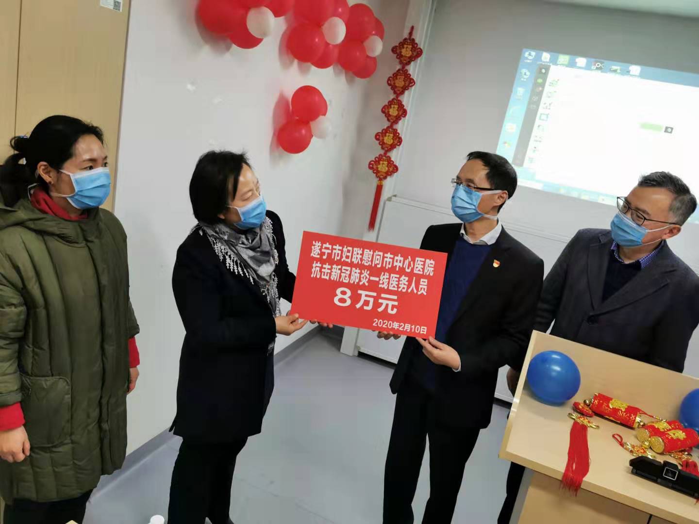 阎仕蓉代表市妇联向遂宁市中心医院抗击新冠肺炎一线的医务人员送上了8万元的慰问金,并对王超平和林正泽说:“你们的妻子虽然是在后方,但也是在前线。作为妇联组织,我们会尽可能的多多帮助你们,也请你们在一线奋战的时候多多保护自己的身体。”(遂宁市妇联供图)
