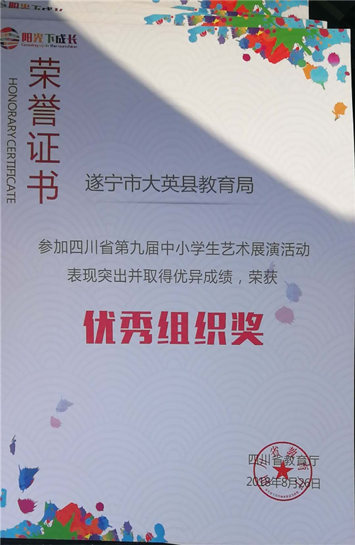 大英县教育局获得优秀组织奖 此次艺术展演活动,经过激烈的角逐,大英县选送的艺术作品荣获一等奖1名,二等奖3名,三等奖2名;艺术案例二等奖1篇,三等奖1篇;艺术工作坊一等奖1所。取得如此成绩,这彰显了我县近年来学校艺术教育的新成就,迈开了学校特色教育的坚实步伐。