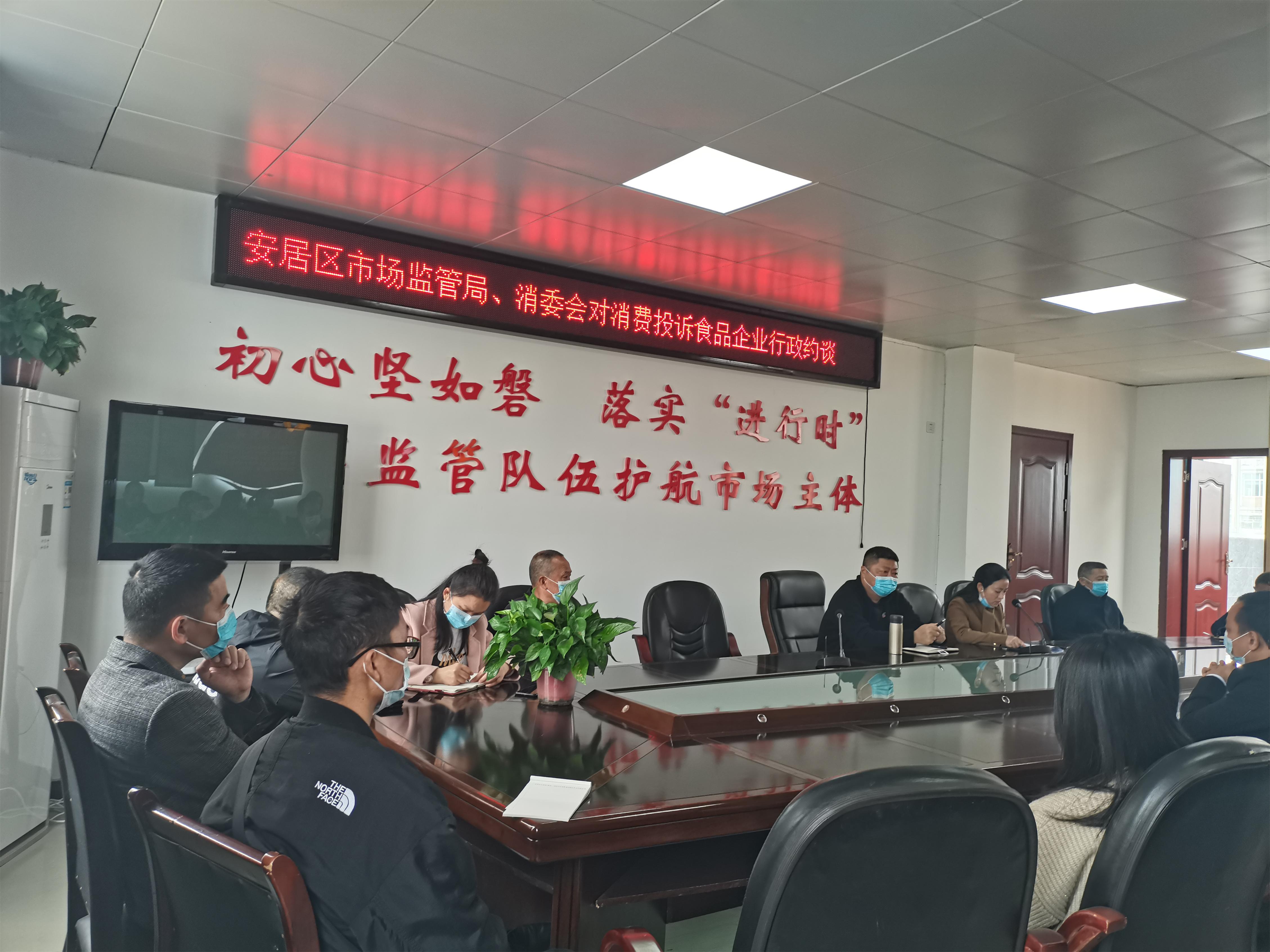 四川新闻网消息 2022年3月29日上午,遂宁市安居区市场监管局、消委会在局四楼会议室对辖区内好吃嘴、思瑞等6户食品生产企业就2021年食品消费投诉进行了行政约谈。