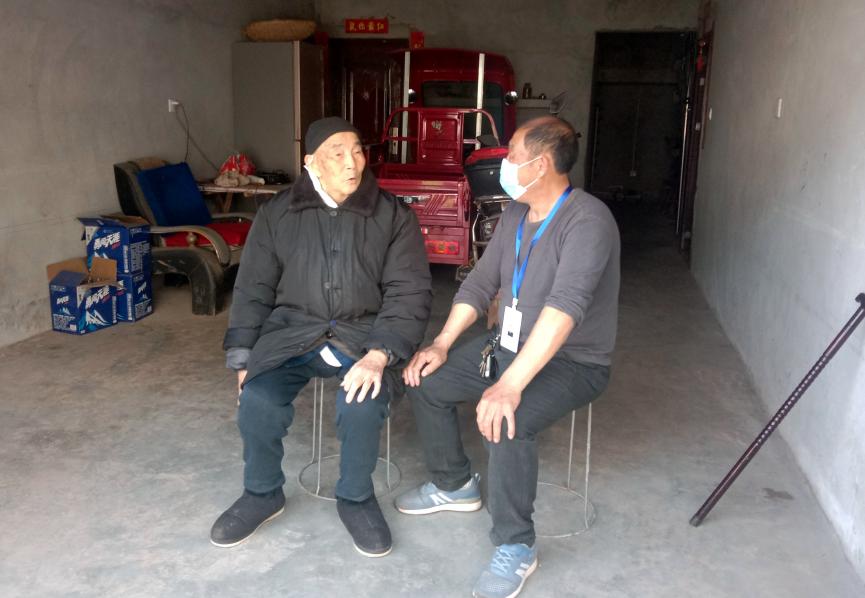 图为夏先友了解村民袁大爷高龄补贴发放情况