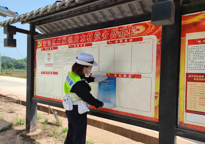 四川新闻网消息 为深入开展“美丽乡村行”交通安全巡回宣传活动,进一步提高广大群众交通参与者的安全意识,有效预防道路交通事故的发生。4月18日,遂宁市安居区公安分局交警大队民警走进辖区三家镇利用“一栏一标语”交通安全宣传阵地,营造文明交通浓厚氛围。
